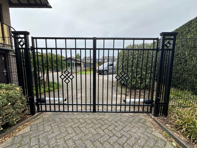 De poorten bij Hekwinkel.nl zijn zowel handbediend als elektrisch verkrijgbaar. Kies je de optie handbediend, dan wordt de poort geleverd met een Locinox slot en klink. Ook worden de middenstop en de valpennen meegeleverd om de poort vast te zetten.