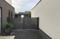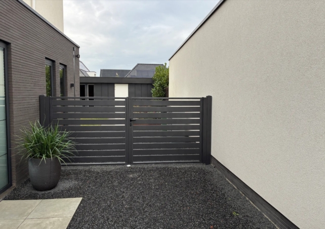 Als je een poort zoekt zonder al teveel poespas, dan zit je met de Regge beslist goed. Dit model heeft een spijlen van 120×20 mm met een tussenruimte van 20 mm.
