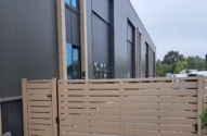 Als je een poort zoekt zonder al teveel poespas, dan zit je met de Regge beslist goed. Dit model heeft een spijlen van 120×20 mm met een tussenruimte van 20 mm.